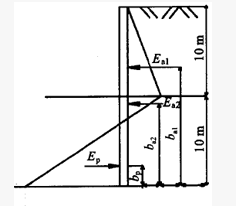 已知悬臂支护结构计算简图(未按比例绘制)如习图7.1.3所示,砂土土性参数:γ=18kN/m3,c=0kPa,=30°,未见地下水,图中Ea1、Ea2和Ep分别表示净主动土压力和净被动土压力,ba1、ba2和bp分别表示上述土压力作用点的高度。支护结构的抗倾覆稳定性可按式
