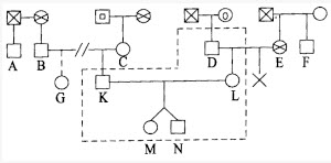 [单选题]根据下列家系图,回答问题。关于该家系图中各人物关系,描述错误的是()A . F为E的弟弟B . M和N是双胞胎C . G为B和C领养之女D . L为D和E所生之女E . B和C为已分居的夫妇