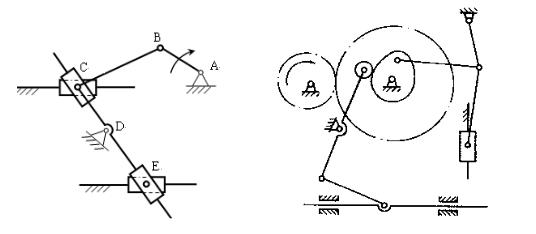 指出下两图所示各机构的复合铰链、局部自由度和虚约束,计算机构的自由度,并判断它们是否具有确定的运动。