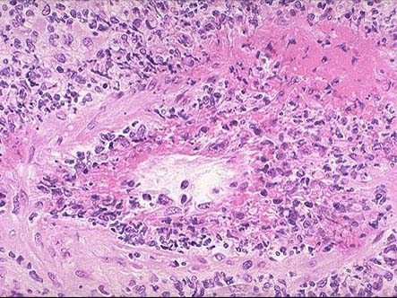 [单选题]韦格氏肉芽肿患者病变部位镜下可出现如图所示改变,下列关于该病说法错误的是()A.30~50岁多见,男性略多B.在动脉壁、动脉周围或血管外部区域出现肉芽