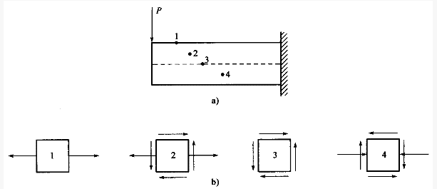 (2006)题图a)所示悬臂梁,给出了1、2、3、4点处的应力状态如题图b)所示,其中应力状态错误的位置点是:()