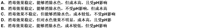 [单选题,A1型题] 二氧化氯消毒的特点是()A . 消毒效果稳定,能够消除水色,但成本高,且受pH影响B . 消毒效果稳定,能够消除水色,不受pH影响,但成本高C . 消毒效果不稳定,但能够消除水色,成本较低,不受PH影响D . 消毒效果稳定,但对水色效果不明显,成本高,且受PH影响E . 消毒效果稳定,能够消除水色,成本较低,但受PH影响