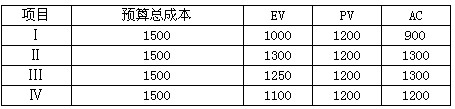 [单选题] 项目Ⅰ、Ⅱ、Ⅲ、Ⅳ的工期都是三年,在第二年末其挣值分析数据如下表所示,按照趋势最早完工的应是项目(57) 。(57)A. Ⅰ B. Ⅱ C. Ⅲ D. Ⅳ