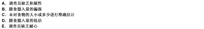 [多选题]回顾法调查的误差来源有( )。A.膳食摄入量的漏报B.膳食摄入量的低估C.未对食物的大小或多少进行准确估计D.调查员缺乏积极性E.调查员缺乏耐心