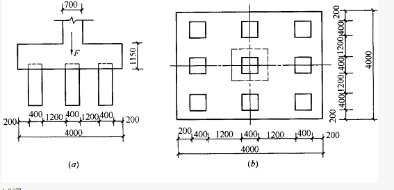 某建筑柱下桩基承台,柱及承台相应尺寸见图6.1.7所示,柱为方柱,位于承台中心,承台顶面处相应于作用的基本组合时的轴压力F=2700kN,承台采用C30混凝土(fT=1.43N/mm2),钢筋的混凝土保护层厚度取100mm。按《建筑地基基础设计规范》作答。