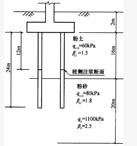 [单选题]某泥浆护壁灌注桩桩径800mm,桩长24m,采用桩端桩侧联合后注浆,桩侧注浆断面位于桩顶下12m,桩周土性及后注浆桩侧阻力与桩端阻力增强系数如图所示。