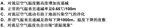 [单选题,A1型题] 有关大气对流层特征和卫生学意义哪一项论述是错误的()A . 对流层空气温度随高度增加而递减B . 正常的气温垂直递减率是0.65℃/100mC . 对流层空气流动有助于地面污染空气的净化D . 所谓气温垂直递减是指每下降100m,温度下降度数E . 我们研究的大气卫生,主要是指对流层大气