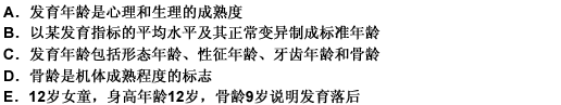 [单选题,A2型题] 下面关于发育年龄哪一种描述是错误的()A . 发育年龄是心理和生理的成熟度B . 以某发育指标的平均水平及其正常变异制成标准年龄C . 发育年龄包括形态年龄、性征年龄、牙齿年龄和骨龄D . 骨龄是机体成熟程度的标志E . 12岁女童,身高年龄12岁,骨龄九岁说明发育落后