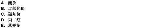 [多选题] 评价油脂酸败常用的卫生学指标有()A . 酸价B . 丙二醛C . 过氧化值D . 羰基价E . K值