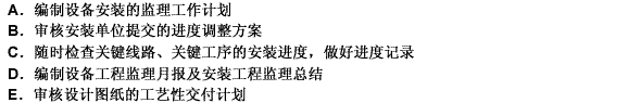 [多选题] 设备安装过程中,设备监理工程师需协助业主完成的工作有()。A . 编制设备安装阶段进度控制监理工作细则B . 确认对设备安装各项工作所做的进度安排C . 确定安装施工单位D . 确定设备安装的工期目标E . 办理有关工程建设手续(施工许可、质量监督等)