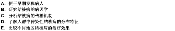[单选题]报告涂阳患病率和菌阳患病率的目的是A.便于早期发现病人,B.研究结核病的病因学C.分析结核病的传播机制D.了解人群中传染性结核病的分布特征E.比较不同地区结核病的治疗效果