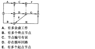 [多选题] 某分部工程双代号网络计划如下图所示,其存在的绘图错误有()。A .多个终点节点B .多个起点节点C . c.节点编号有误D .存在循环回路E .有多余虚工作