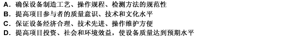 [单选题]没备质量监理目标是()。A.确保设备制造工艺、操作规程、检测方法的规范性B.提高项目参与者的质量意识、技术和文化水平C.保证设备经济合理、技术先进、操