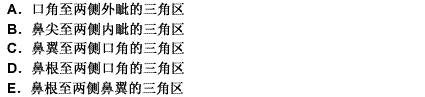 [单选题,A2型题,A1/A2型题] 面部危险三角区是指()A . 口角至两侧外眦的三角区B . 鼻根至两侧鼻翼的三角区C . 鼻尖至两侧内眦的三角区D . 鼻根至两侧口角的三角区E . 鼻翼至两侧口角的三角区