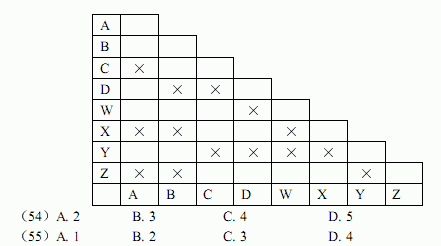 有八种化学药品 A、B、C、D、W、X、Y、Z 要装箱运输。虽然量不大,仅装 1箱也装不满,但出于安全考虑,有些药品不能同装一箱。在下表中,符号“×”表示相应的两种药品不能同装一箱。运输这八种化学药品至少需要装(54)箱,实现这种最少箱数的装箱方案(不计装箱顺序)可有(55)个。