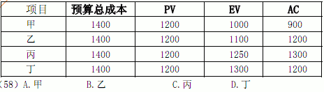项目甲、乙、丙、丁的工期都是三年,在第二年末其挣值分析数据如下表所示,按照趋势最早完工的应是(58) 。