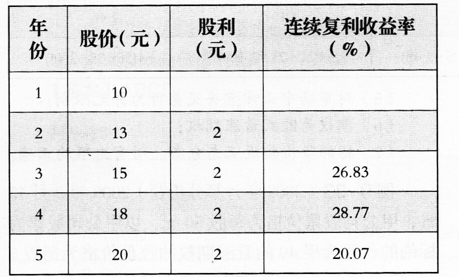 已知甲公司按照连续复利计算的年股利收益率为10%。 要求:(1)计算连续复利的年度无风险利率; (2)计算表中第2年的连续复利收益率以及甲公司股票连续复利收益率的标准差; (3)使用布莱克一斯科尔斯模型计算该项期权