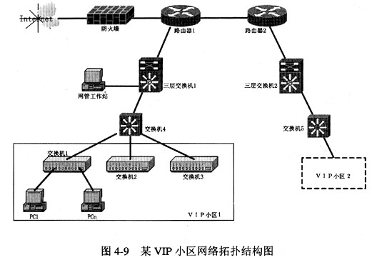 某VIP小区网络解决方案如图4-9所示,该网络原先使用的是国外品牌的交换机,随着网络规模的扩大,增添了部分国产品牌的交换机,交换机1至交换机5均是国产10M/100M自适应交换机。网络核心层由三层交换机1、三层交换机2、路由器1、路由器2和防火墙组成。