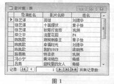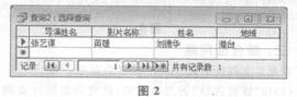 (2)以“录影集”表、“演员”表和“导演”表为数据源,创建查询“查询2”,查询由“张三”导演,“中国港台”演员出演的影片。结果显示“导演姓名”、“影片名称”、“演员姓名”和“地域”字段。查询结果如图2所示。