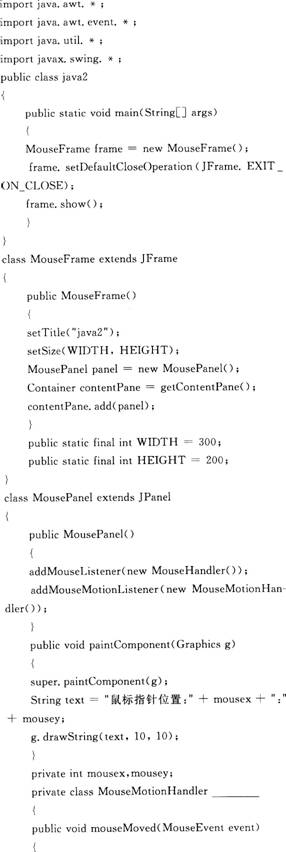 [试题]本题的功能是跟踪鼠标在窗口的操作,以及在窗口的坐标,包括移进、移出、移动、单击、释放和拖曳,并将这些信息显示在窗口的文字标签上。 import java.awt.*; import java.awt.event.*; import javax.swing.*; public class java3 extends JFrame. implements MouseL- istener MouseMotionListener { private JLabel statusBar; public jav