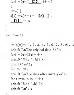 例如:若a所指数组中的数据依次为:1、2、3、4、5、6、7、8、9,则逆置后依次为:9、8、7、6、5、4、3、2、1。