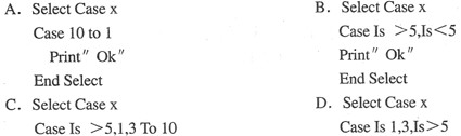 [单选题]假设X的值是5,则执行以下语句时,可得到的输出结果是ABCDEF的Select Case语句是 ( )A.Select Case X Case 10 To 1 Print“ABCDEF” End SelectB.Select Case X Case Is>15,Is<5 Print"ABCDEF" End SelectC.Selecl Case K Case Is>5,1,3,To 10 Print"ABCDEF" End SelectD.Select Case X Case 1,3,I