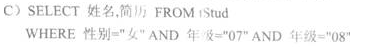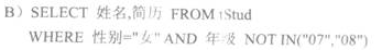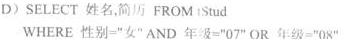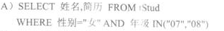 [单选题]在tStud表中查询性别为“女”,年级为“07”或“08”的学生姓名和简历的SQL查询语句为( )。A.SELECT 姓名,简历 FROM tStud WHERE 性别="女" AND 年级 IN("07","08")B.SELECT 姓名,简历 FROM tStud WHERE 性别="女" AND 年级 NOT IN("07","08")C.SELECT 姓名,简历 FROM tStud WHERE 性别="女" AND 年级="07" AND 年级="08