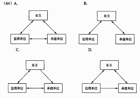 [单选题]在实施监理的工程项目上,业主、监理单位和承建单位三方之间的工作交往关系应为(64)所示的关系。A.B.C.D.
