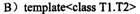 [单选题]有如下模板声明:templateclass A;下列声明中,与上述声明不等价的是A.t有如下模板声明: template<typename T1,typename T2>class A; 下列声明中,与上述声明不等价的是A.template<class T1,class T2>class A;B.template<class T1,typename T2>class A;C.template<typename T1,class T2>class A;D.template<typename T1,