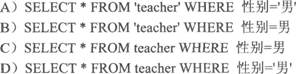 [单选题]下列SELECT语句语法正确的是( )。A.)SELECT木FROM‘teacher' WHERE性别=‘男’B.)SELECT宰FROM‘teacher’WHERE性别=男C.)SELECT木FROM teacher WHERE性别=男D.)SELECT木FROM teacher WHERE性别=‘男’