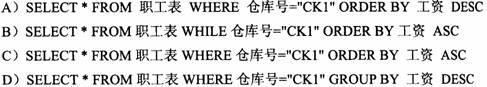 [单选题]设有职工表(其中包含字段:职工号,仓库号,工资),查询仓库号是“CK1”的职工信息,并按工资降序排序,正确的SQL命令是( )。A.)SELECT﹡FROM职工表WHERE仓库号=”CK1”ORDER BY工资DESCB.)SELECT﹡FROM职工表WHILE仓库号=”CK1”ORDER BY工资ASCC.)SELECT﹡FROM职工表WHERE仓库号=”CK1”ORDER BY工资ASCD.)SELECT﹡FROM职工表WHERE仓库号=”CK1”GROUP BY工资DESC