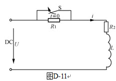 计算题:如图D-11所示为发电机的励磁电路,正常运行时,S断开,当发电机外线路短路时,其端电压下降,为防止系统不稳定,须快速提高发电机端电压,故强励动作合上S,将R1短接。已知:U=220V,R1=40Ω,L=1H,R2=20Ω,求S闭合后的变化规律。