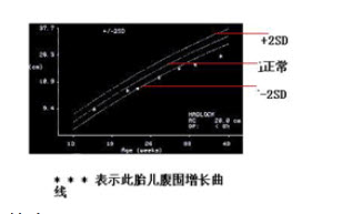 此图是妊娠中晚期胎儿腹围增长曲线图,可见比正常曲线________,它提示________。