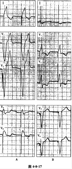 患者女性,57岁,因房室传导阻滞植入起搏器。图4-8-17A为植入起搏器后3个月复查的心电图,图4-8-17B为植入起搏器后6个月复查的心电图。