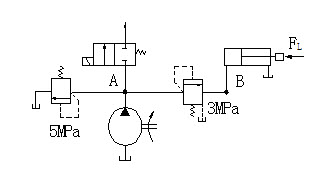 [试题]分析图示液压系统图并回答问题:1) 油缸活塞杆伸出,回路压力为2MPa,这时两电磁阀应如何控制?2) 油缸活塞杆缩回,回路压力为3.5MPa,这时两电磁阀应如何控制?