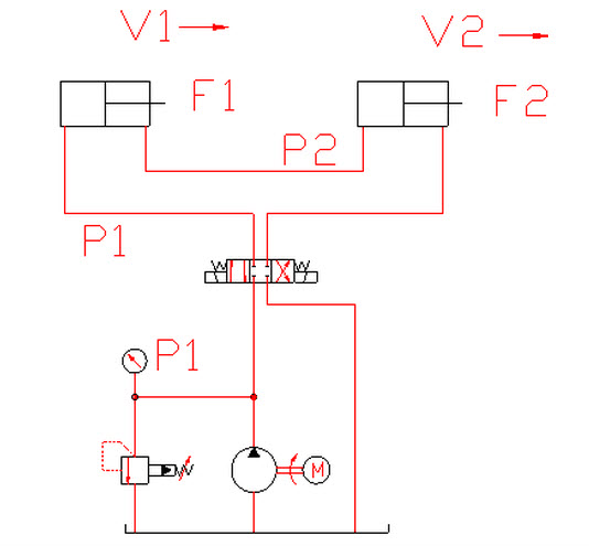 计算题:图示一个液压泵驱动两个结构相同相互串联的液压缸,已知两缸尺寸相同,缸筒内径D=80mm,活塞杆直径d=40mm,负载F1=F2=6000N,液压泵供油流量Q=25L/min,求液压泵的供油压力P1及两个液压缸的活塞运动速度V1,V2。