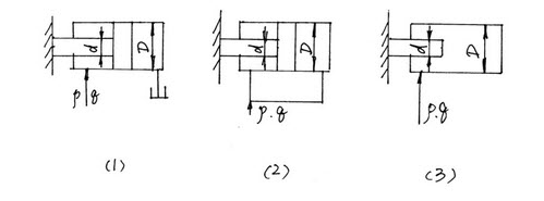 计算题:如图所示三种形式的液压缸,活塞和活塞杆直径分别为D、d,如进入液压缸的流量为q,压力为P,若不计压力损失和泄漏,试分别计算各缸产生的推力、运动速度大小和运动方向。