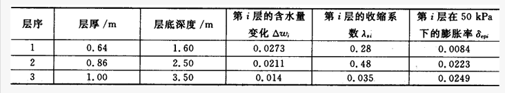 利用下表中所给的数据,按《膨胀土地区建筑技术规范》(GBJ112-1987)规定,计算膨胀土地基分级变形量(sxc),其结果应最接近于()。