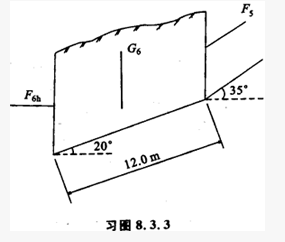 某滑坡拟采用抗滑桩治理,桩布设在紧靠第6条块的下侧,滑面为残积土,底为基岩,请按习图8.3.3所示及下列参数计算对桩的滑坡水平推力F6h是下列()数值。已知F5=380kN/m,G6=420kN/m,残积土=18°,c=11.3kPa,安全系数γ=1.15。()