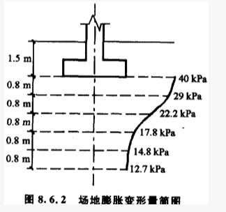 某场地为膨胀土场地,场地的土容重为18kN/m3,基础埋深为1.5m,基础底面以下的附加应力分布情况如图所示,垂直压力为50kPa时膨胀率为1.2%,垂直压力为100kPa时膨胀率为0.7%,当地9月至次年2月蒸发力之和与全年蒸发力的比值为0.2,全年中干燥度大于1的月份的蒸发力与降水量差值之总和为200mm,建筑场地为经常受水浸湿的场地,试计算地基土的膨胀变形量为()。