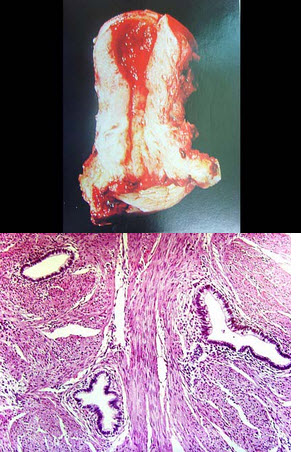 A . 巨检及镜下如图所示:位于宫颈壁深层8mm处见分化好的、外形扭曲的腺体,无间质反应。结合临床病史与病理,你认为最有可能的诊断为() B .