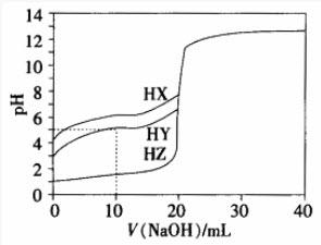 25℃时,用浓度为0.1000mol/L的NaOH溶液滴定20.00mL浓度均为0.1000mol/L的三种酸HX、HY、HZ,滴定曲线如图所示。下列说法不正确的是()。