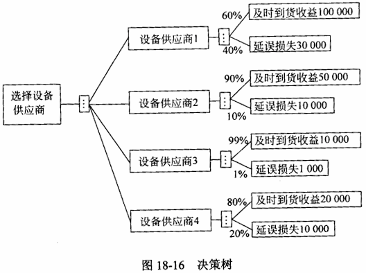 博学公司项目经理向客户推荐了四种供应商选择方案。每个方案损益值已标在图18-16的决策树上。根据预期收益值,应选择设备供应商()