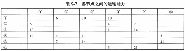 如图9-7所示为某地区的运输网。各节点之间的运输能力如表9-7所示(单位:万吨/小时):从节点①到节点⑥的最大运输能力(流量)可以达到()万吨/小时。