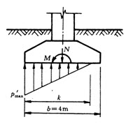 如图所示桥墩基础,已知基础底面尺寸b=4m,l=10m,作用在基础底面中心的荷载N=4000kN,M=2800kNm,计算基础底面的压力。