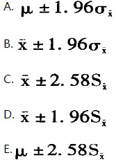 [单选题]测定某地130名正常成年男子样本红细胞数,要估计该地正常成年男子红细胞均数,95%可信限范围是()。A .μ±1.96SXB .X±1.96σXC .X±2.58SXD .X±1.96SXE .μ±2.58σX