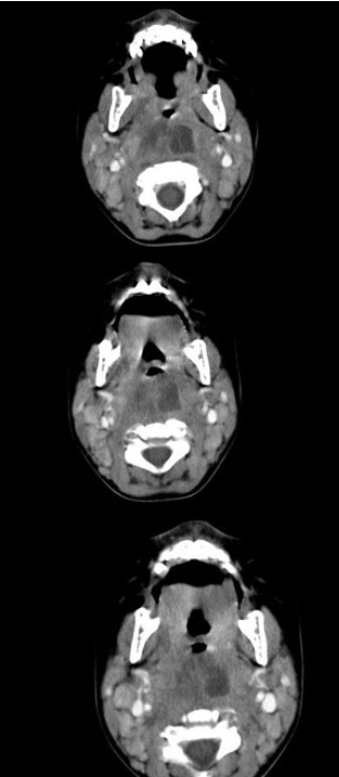 [多选题] 10个月大的婴儿,发热,曾患中耳炎,CT扫描如图所示,请选择正确的描述或诊断()A .咽后壁软组织肿胀B .其内密度不均C .颈椎骨质未见明显异常D .考虑为咽后壁脓肿E .考虑为咽后壁寒性脓肿