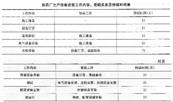 某安装公司承包某制药厂生产设备工程的施工,该制药厂生产设备的主机及控制设备由建设单位从国外订货。制药厂生产设备的主机设备土建工程及机电配套工程由某建筑公司承建,已基本完工。安装公司进场后,按合同工期要求,与建设单位和制药厂生产设备主机及控制设备供应商洽谈,明确了设备主机及控制设备到达施工现场需60天。安装公司依据工程的实际情况编制了该制药厂生产设备工程的施工进度计划(双代号网络图),其中该制药厂生产设备工程的安装工作内容、逻辑关系及工作持续时间见下表。