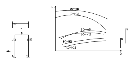 [问答题] 用图解法求同型号、同水源水位、管路对称布置的两台水泵并联工作时的:(1)并联工况点;(2)各泵工况点(要求简述作图步骤)