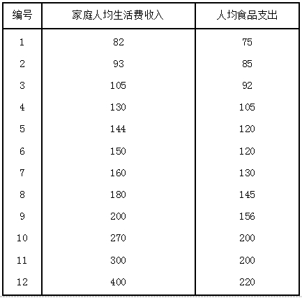 随机抽取某地12户农民家庭为样本,调查得到有关收入与食品支出的资料如下: